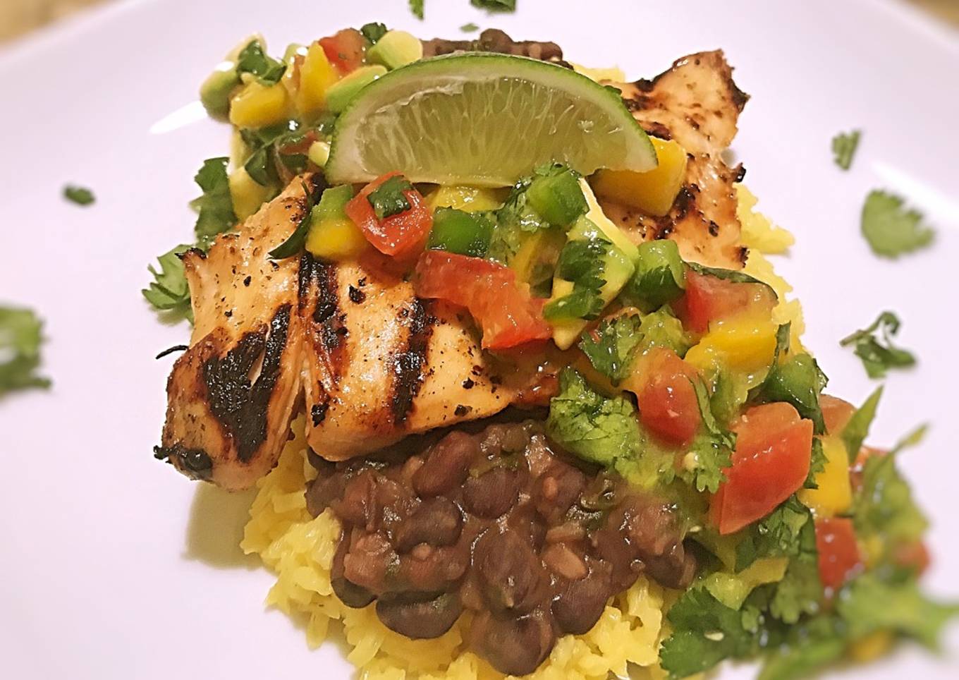 - Serve the chicken on top of the beans and rice and top with the pico and serve with lime wedges