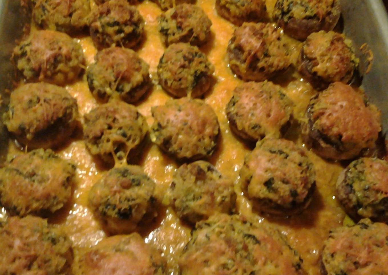 - Stuff mushrooms and place in greased pan. Sprinkle with parm cheese (and extra cheddar).