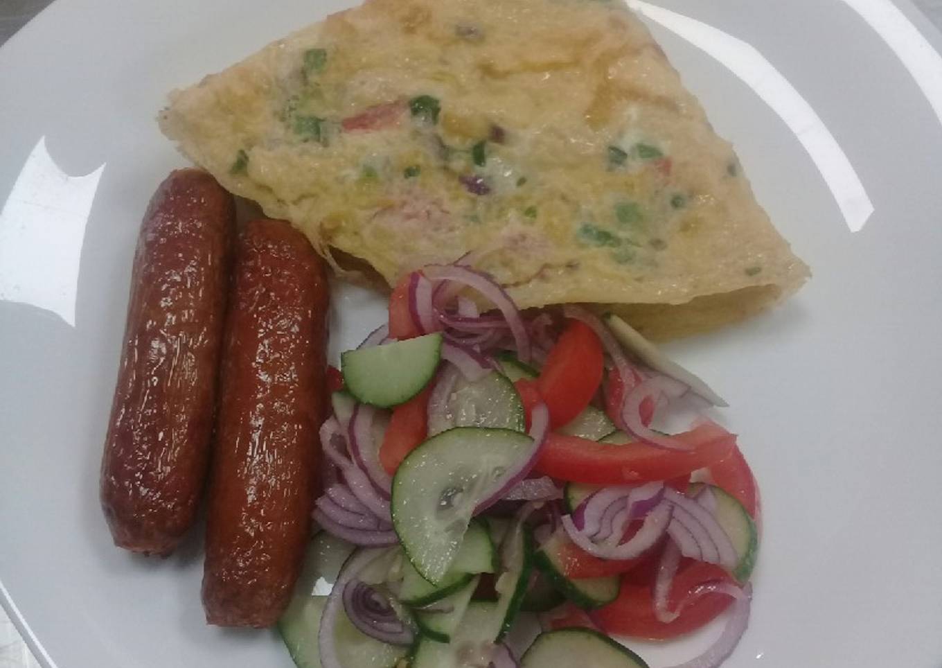 - In a plate, fold your omellette the way you love, add your 2 sausages, salad n serve.