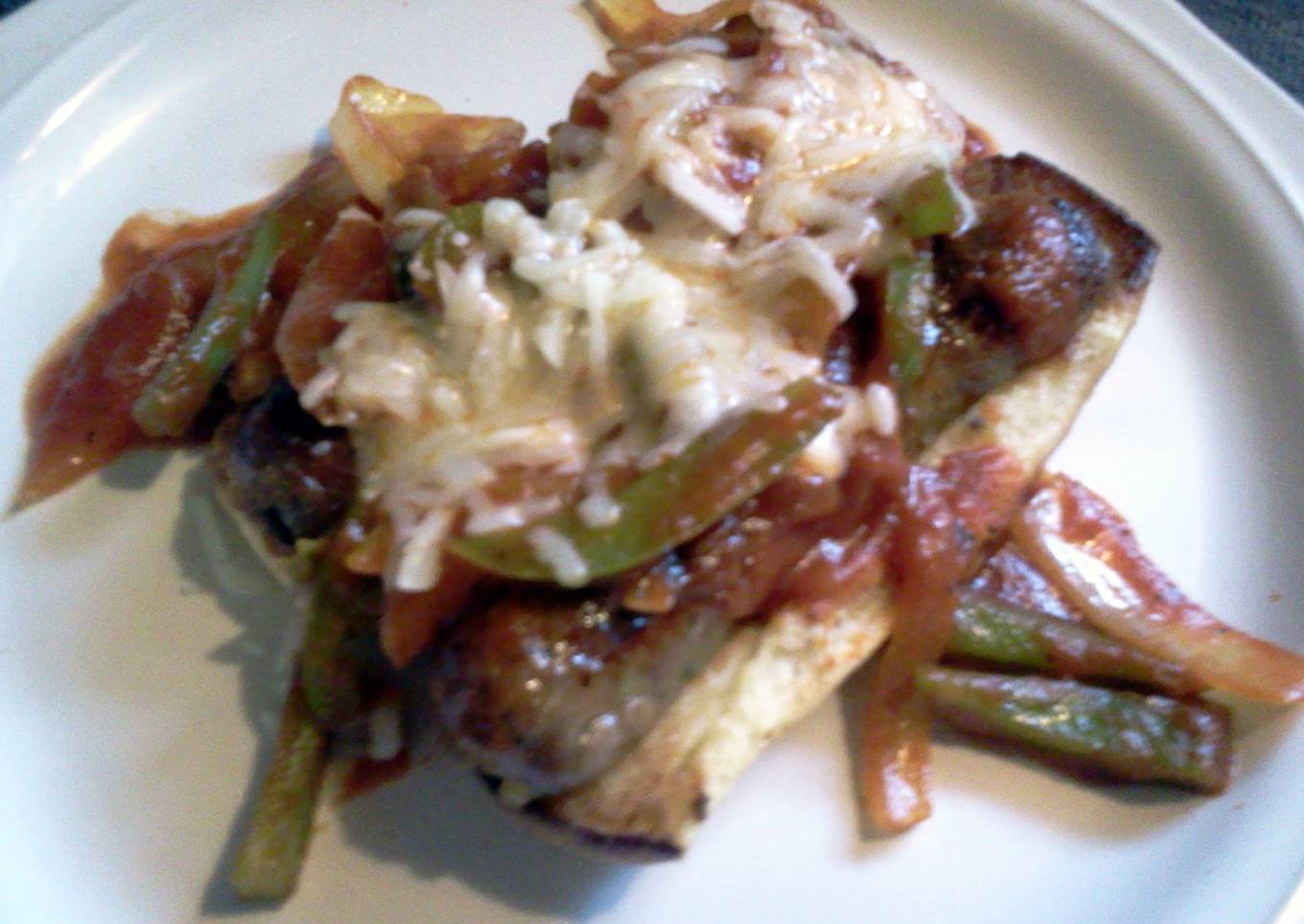 - When buns are ready, place on plate. Split sausages lengthwise and place on bun. Top with sauce, onions & peppers. Sprinkle with cheese. Enjoy!