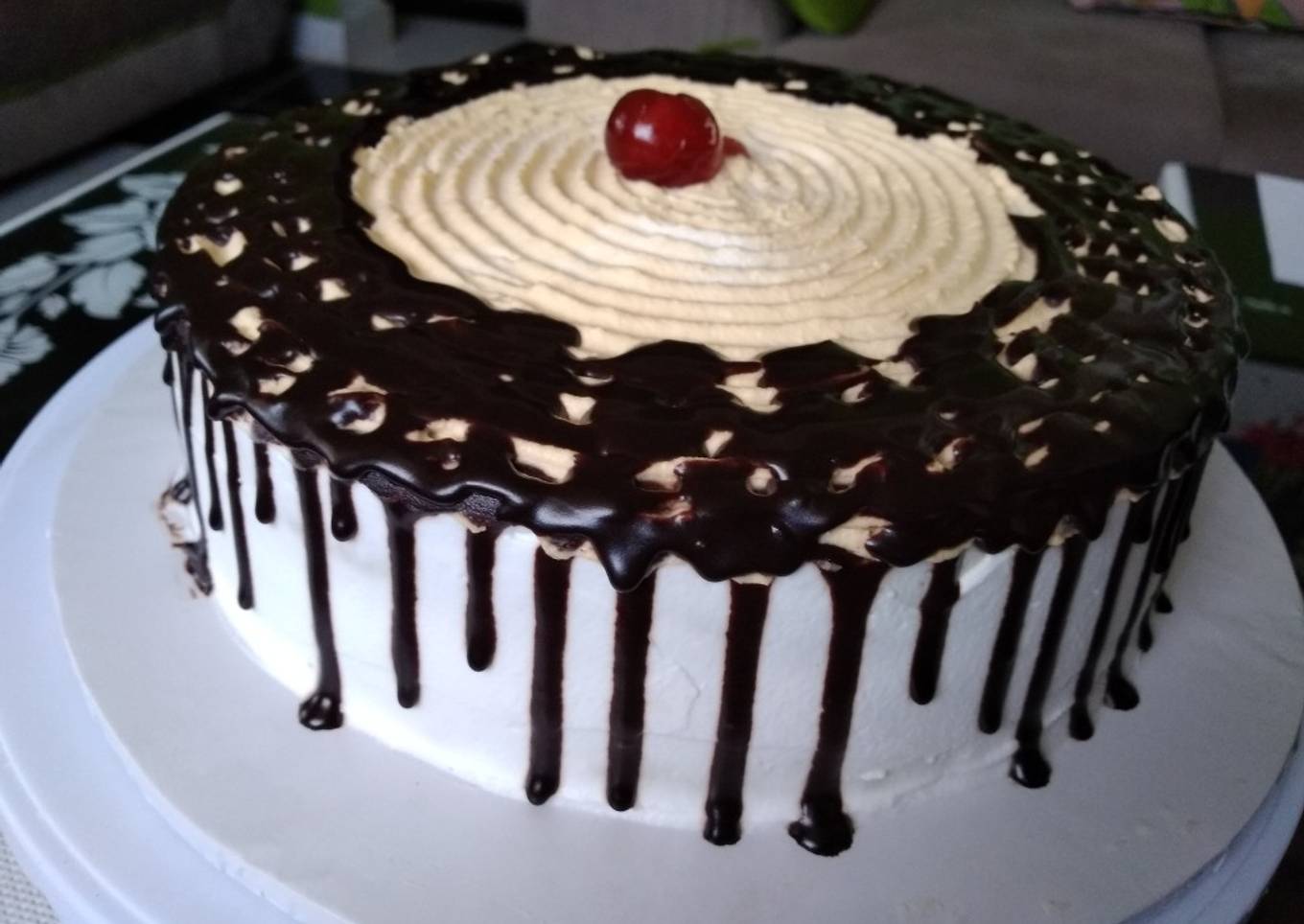 - Melt the chocolate chips n drip on the cake covered with whip cream